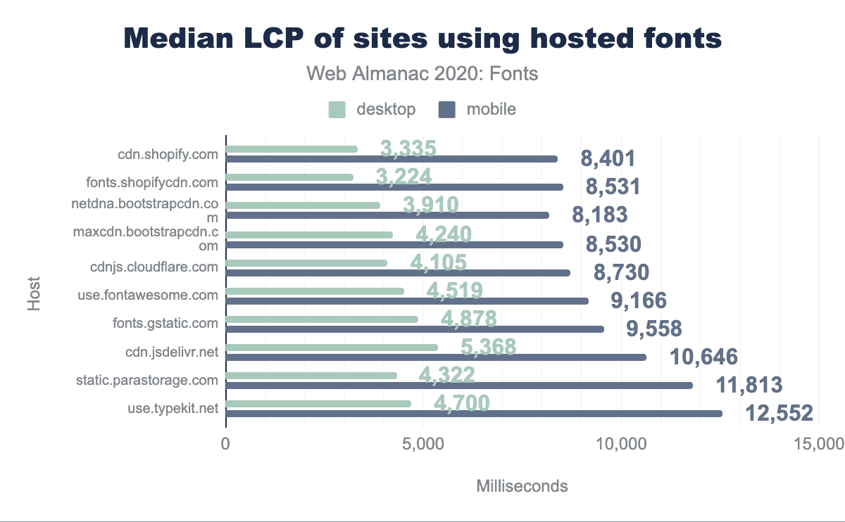 static.parastorage.comはデスクトップで1,443ミリ秒、モバイルで3,060ミリ秒ともっとも速く、fonts.shopifycdn.comはデスクトップで1,407ミリ秒、モバイルで4,426ミリ秒、cdn.shopify.comは1,492ミリ秒、4,676ミリ秒、cdnjs.cloudflare.comは2,150ミリ秒、5,167ミリ秒、maxcdn. bootstrapcdn.comは2,166と5,224、netdna.bootstrapcdn.comは2,239と5,304、use.fontawesome.comは2,350と5,572、fonts. gstatic.comは2,543と5,709、cdn.jsdelivr.netは2,603と6,434、use.typekit.netは2,384と7,370になっています。興味深いのは、さまざまなフリー/オープンソースおよび商用サービスを使用しているサイトの速度の違いです。コンテンツの初回ペイント(FCP)と最大のコンテンツフルペイント(LCP)の時間を見ると、Google Fontsを使用しているサイトはほぼ中央に位置していますが、一般的には中央値よりも少し遅くなっています。データセットの中でもっとも高速なサイトはShopifyとWix(parastorage.comからアセットを提供)であり、これらのサイトは少数の高度に最適化されたファイルに焦点を当てていると推測されます。一方、Googleは、(言語によって)サイズが大きく異なるWebフォントをグローバルに提供しており、その結果、中央値の時間が若干遅くなっていると思われます。