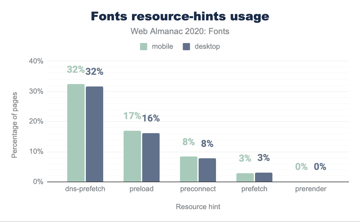 dns-prefetchはデスクトップとモバイルの両方のサイトで32%、preloadはデスクトップで17%、モバイルで16%、preconnectは両方で8%、prefetchは両方で3%、prerenderは両方で0%の割合で使用されています。HTMLにリソースヒント要素を追加すると、2つ目の接続が早く始まります。さまざまなリソースヒントの設定は、実際のフォントリソースのURLを取得するまでの距離を制御します。もっとも一般的なのは(ウェブページの約32%)dns-prefetchですが、ほとんどの場合、より良い選択肢があります。