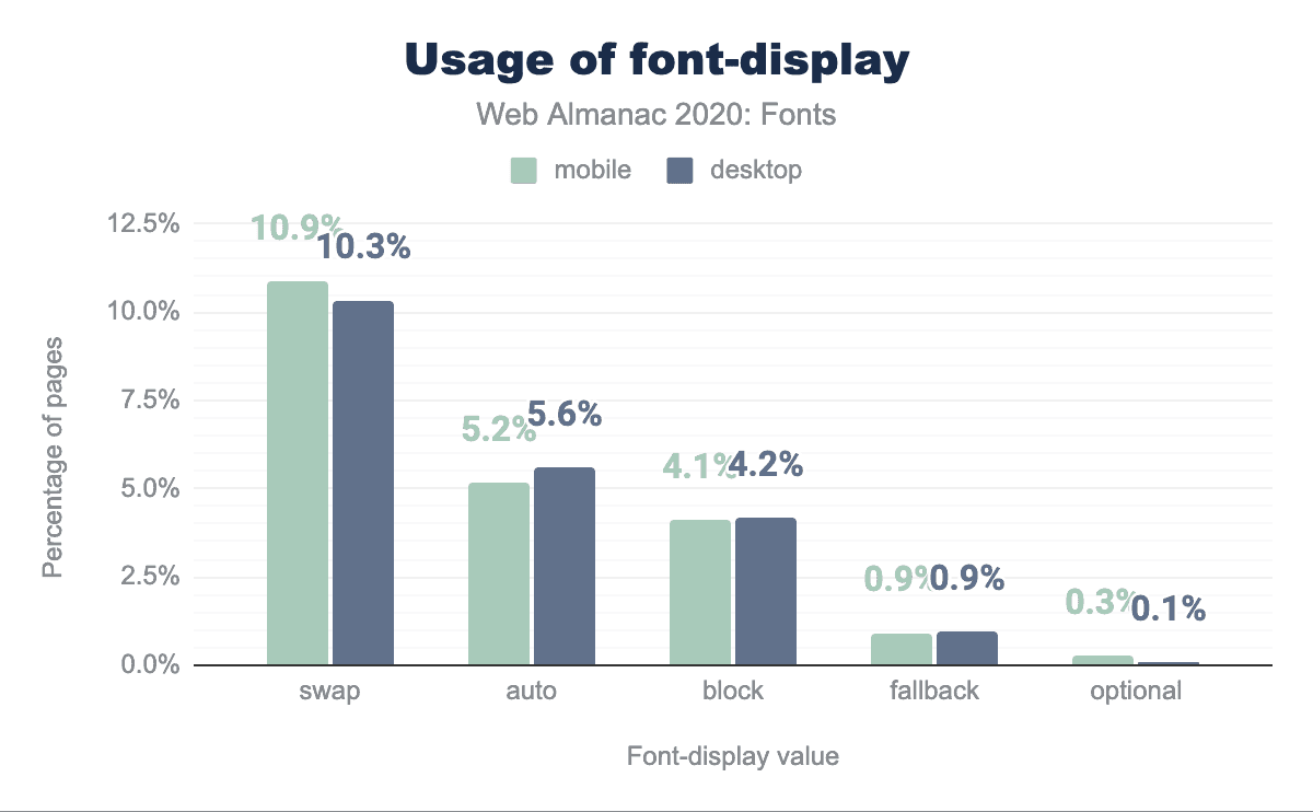 最後に、fallbackを使用する正当な理由のひとつとして、swapと比較して最大コンテンツの描画時間を向上させることが挙げられます(デザイナーの視覚的意図を尊重する可能性が高いです)。そのためか、この設定は人気がなく、約1%のページでしか使われていません。