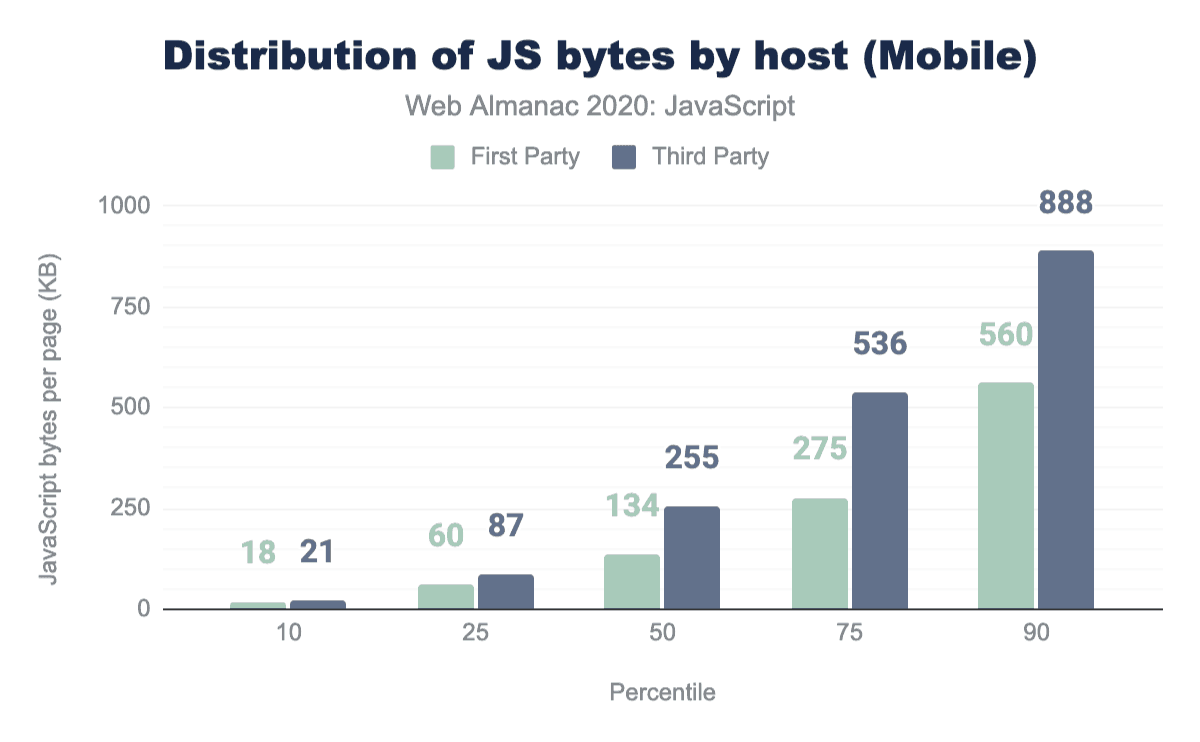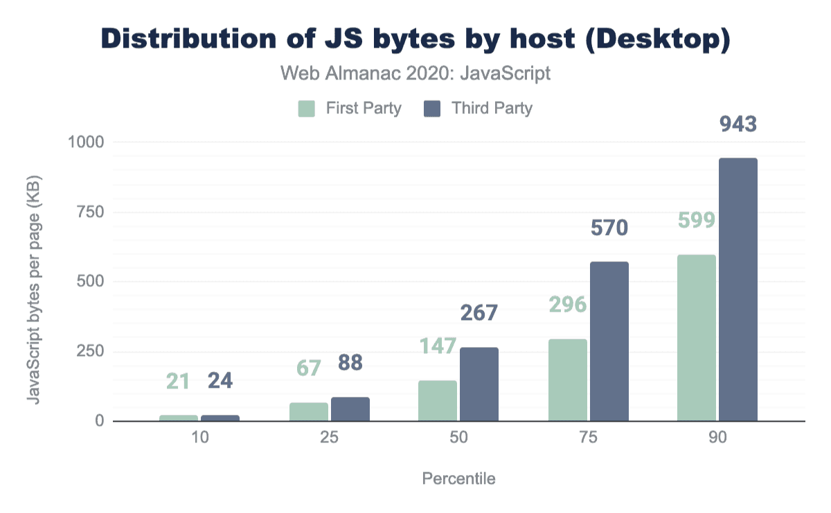 中央値のサイト(50パーセンタイル)では、デスクトップ端末で読み込んだときに444KBのJavaScriptを送信し、モバイル端末ではわずかに少ない(411KBの)JavaScriptを送信しています。