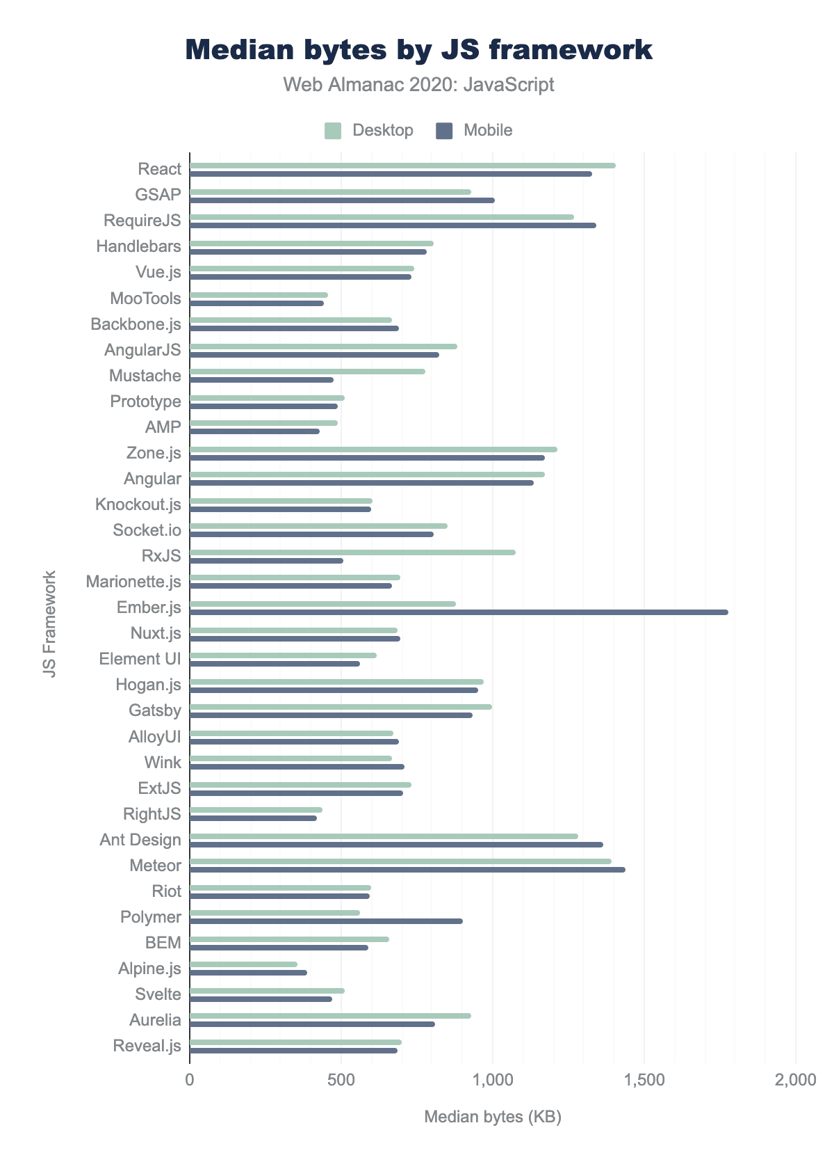使用されているフレームワークを具体的に見てみると、それらを使用しているページのJavaScriptのバイト数の中央値は、whatが使用されているかによって大きく異なることがわかります。