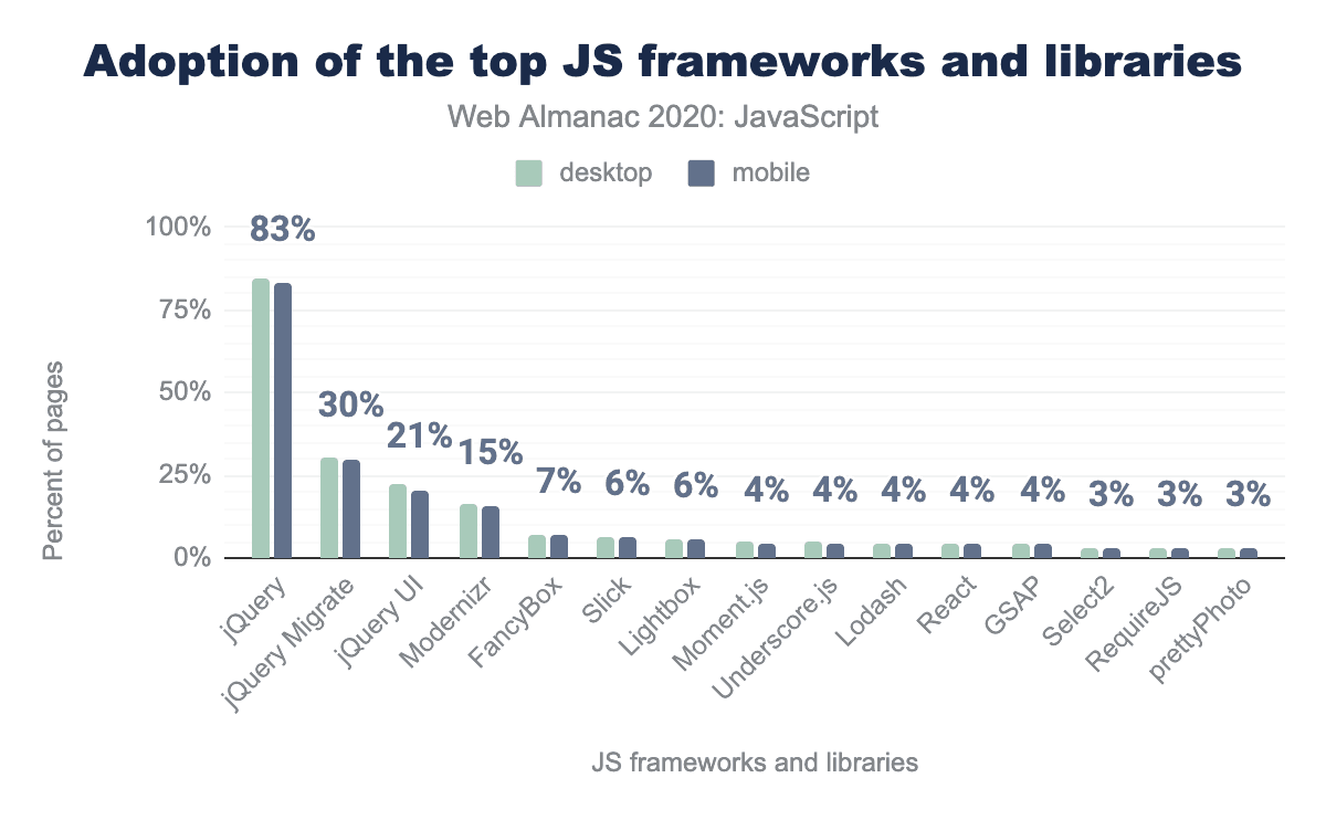 実際、上位10のライブラリのうち、jQuery UI、jQuery Migrate、FancyBox、Lightbox、Slickの6つがjQueryであるか、使用するためにjQueryを必要としていることを考えると、jQueryの優位性はさらに裏付けられています。
