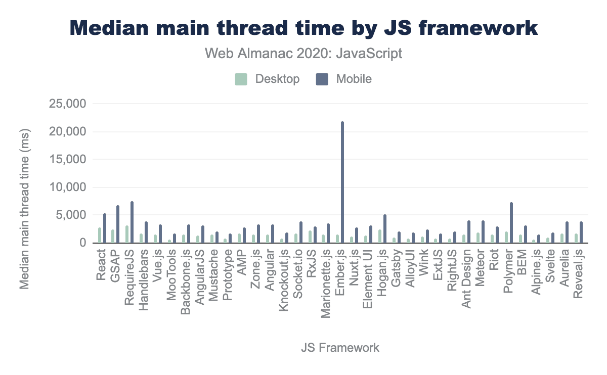 ReactやGSAP、RequireJSなどのツールは、デスクトップやモバイルのページビューに関わらず、ブラウザのメインスレッドに多くの時間を費やす傾向があります。アルパインやスベルテのようなツールは、全体的にコードが少なくなる傾向はありますが、同じツールでもメインスレッドへの影響が少なくなる傾向はあります。