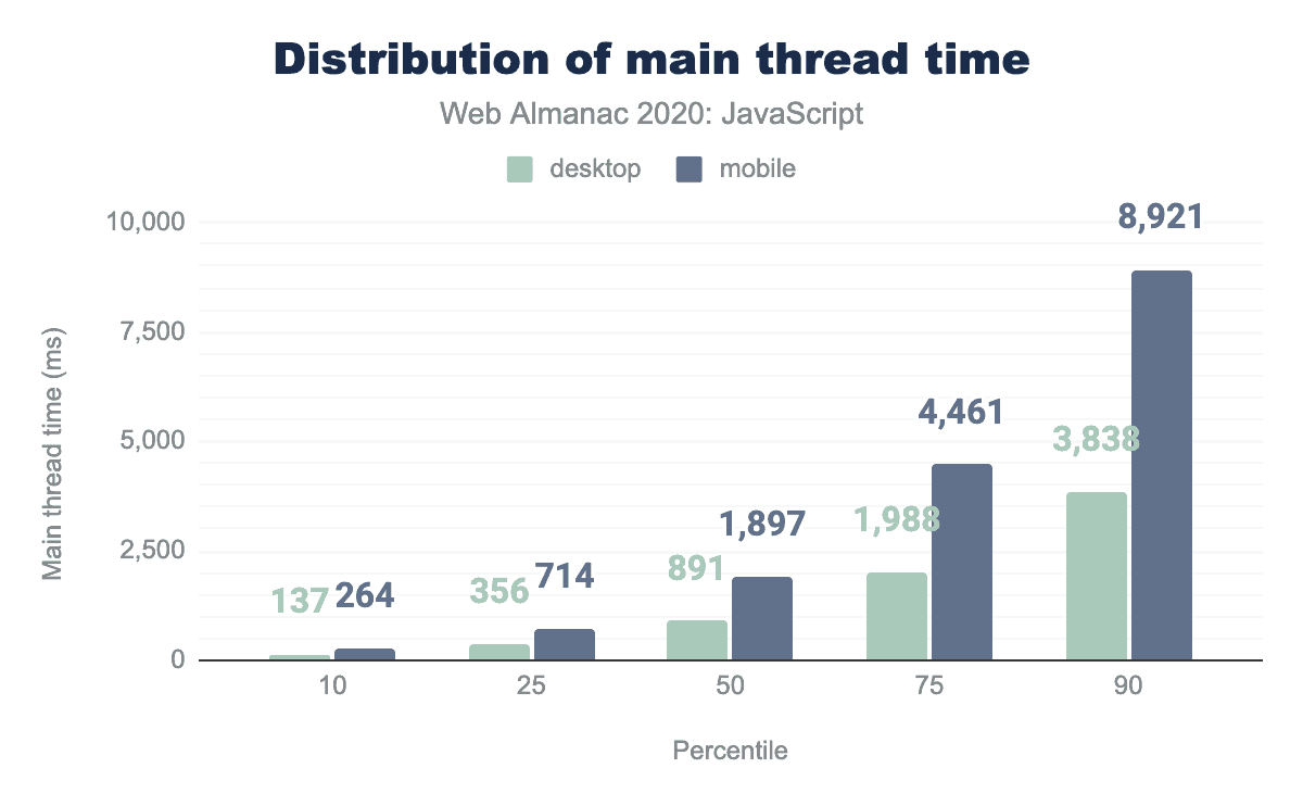 デスクトップサイトの中央値は、JavaScriptのすべての作業を行うブラウザのメインスレッドに891msを費やしています。しかし、モバイルサイトの中央値は1,897ミリ秒と、デスクトップの2倍以上の時間を費やしています。ロングテールのサイトの方がよっぽどヤバい。90パーセンタイルで、モバイルサイトではJavaScriptを扱うメインスレッドの時間が8,921ミリ秒であるのに対し、デスクトップサイトでは3,838ミリ秒であるという驚異的な結果が出ています。
