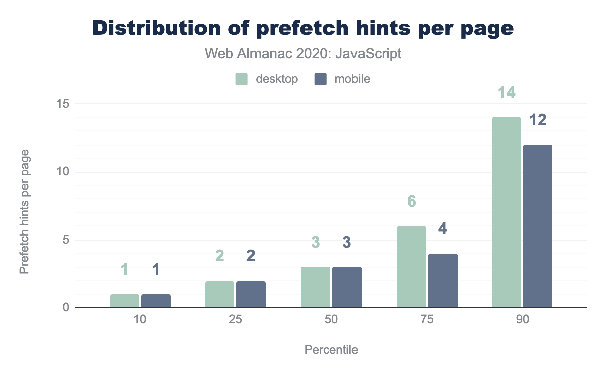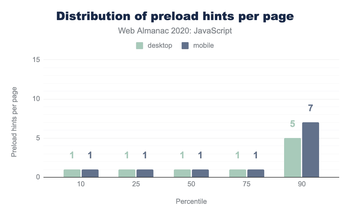 中央値では、prefetchヒントを使ってJavaScriptを読み込むページで3つのヒントが使われていますが、preloadヒントを使っているページでは1つしか使われていません。90パーセンタイル台では12個のprefetchヒントが使用され、90パーセンタイル台では7個のpreloadヒントが使用されています。リソースヒントの詳細については、今年の Resource Hints の章を参照してください。