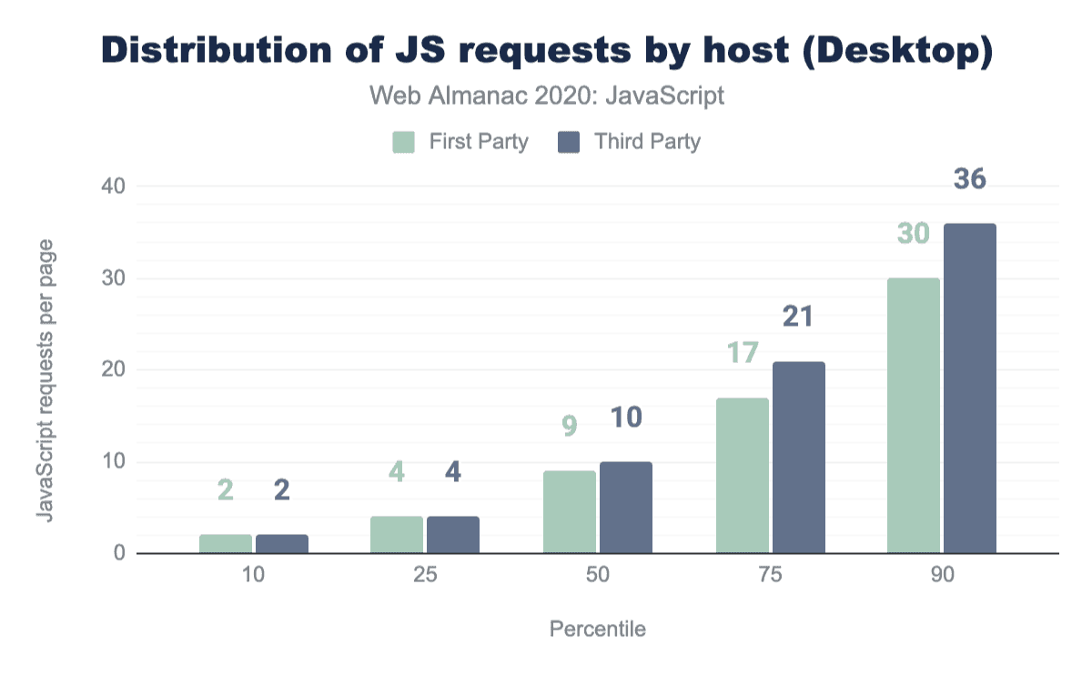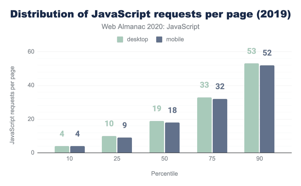 中央値では、ページは20回のJavaScriptリクエストを行います。これは中央値で19回のJavaScriptリクエストを行っていた昨年よりもわずかに増加しています。