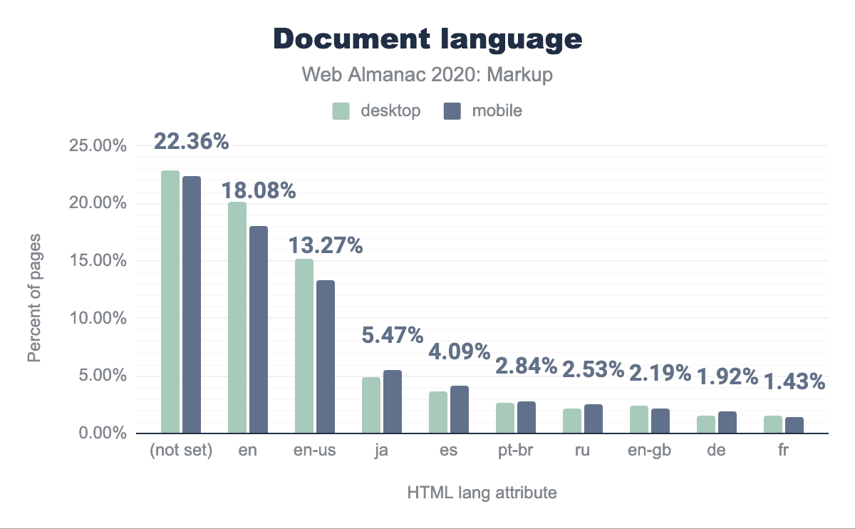 全ドキュメントの22.36%がlang属性を指定していません。一般的にはそうすべきだという意見は多いです、ソフトウェアが最終的に言語を自動的に検出するという事実を無視してドキュメントの言語はプロトコルレベルで指定することもできますが、これは私たちがチェックしなかったことです。