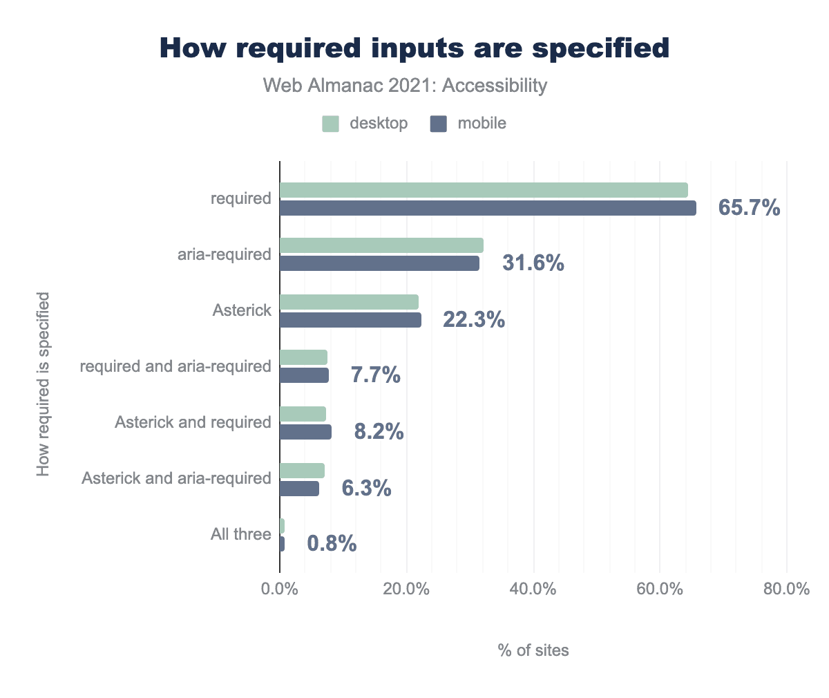 デスクトップサイトの29%(2020年の25%から増加)とモバイルサイトの29%(2020年の25%から増加)が、明示的に割り当てられた role="button" の要素を少なくとも1つ持つホームページを持っていることがわかりました。このことから3分の1近くのウェブサイトが、明示的にボタンの役割を割り当てられたボタンを除いて、セマンティクスを変更するため要素に button の役割を使用しており、これは冗長であることがわかります。