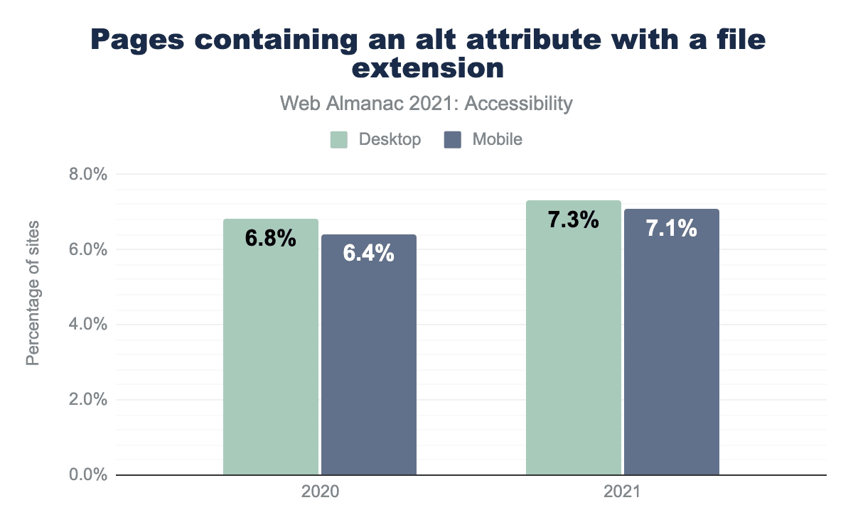 代替テキストの有無の自動チェックは、通常、このテキストの品質を評価するものではありません。役に立たないパターンの1つは、画像のファイル拡張子名での説明です。私たちは、デスクトップ・サイト(alt属性のインスタンスを少なくとも1つ持つ)の7.1%が、少なくとも1つの img 要素の alt 属性の値にファイル拡張子を持つことを発見しました(前年は7.3%でした)。
