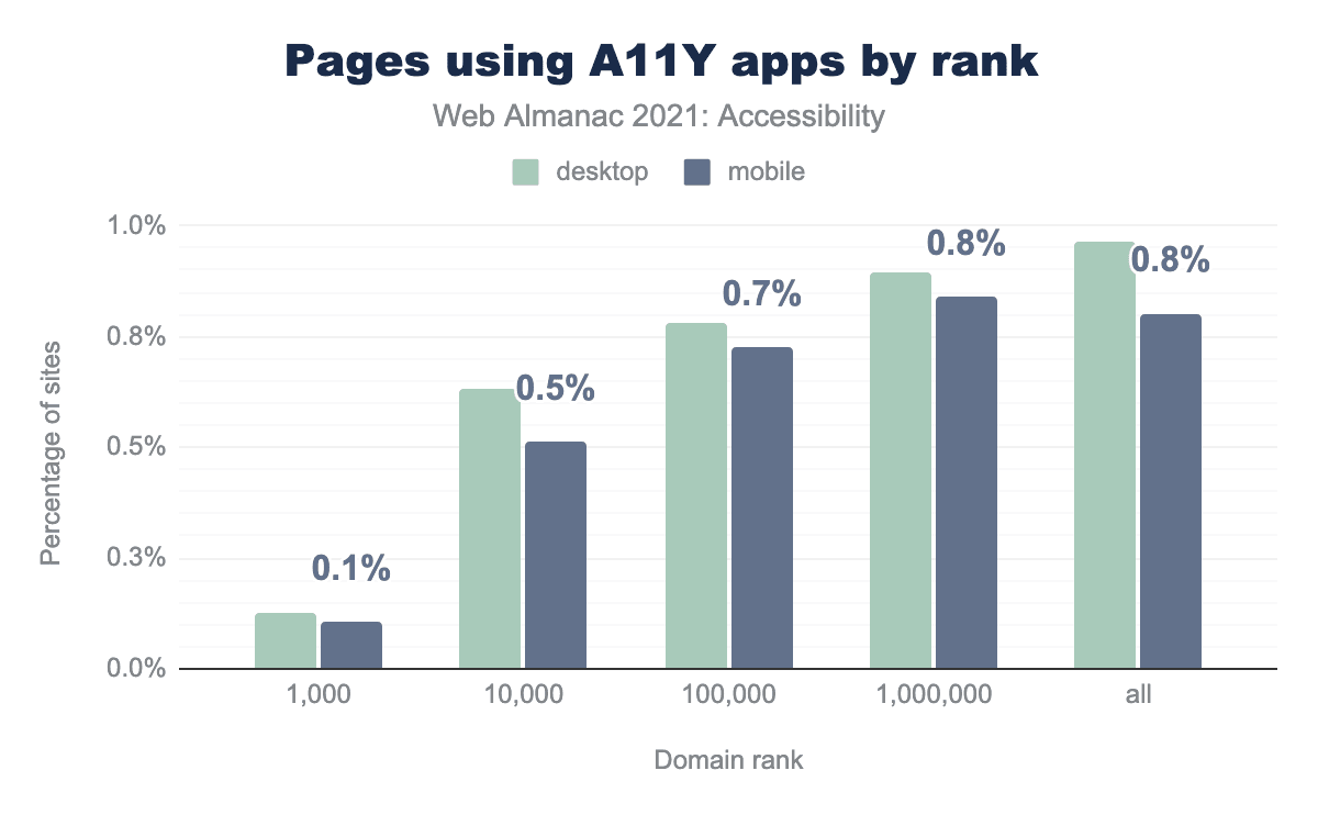 その結果、デスクトップWebサイトの0.96%(6万件以上)で、これらのアクセシビリティ・オーバーレイが使用されていることがわかりました。この分野の有名な製品のリストを照会したことは、注目に値します。しかし、このリストは網羅的なものでないので、この指標は実際にはもっと高い可能性があります。