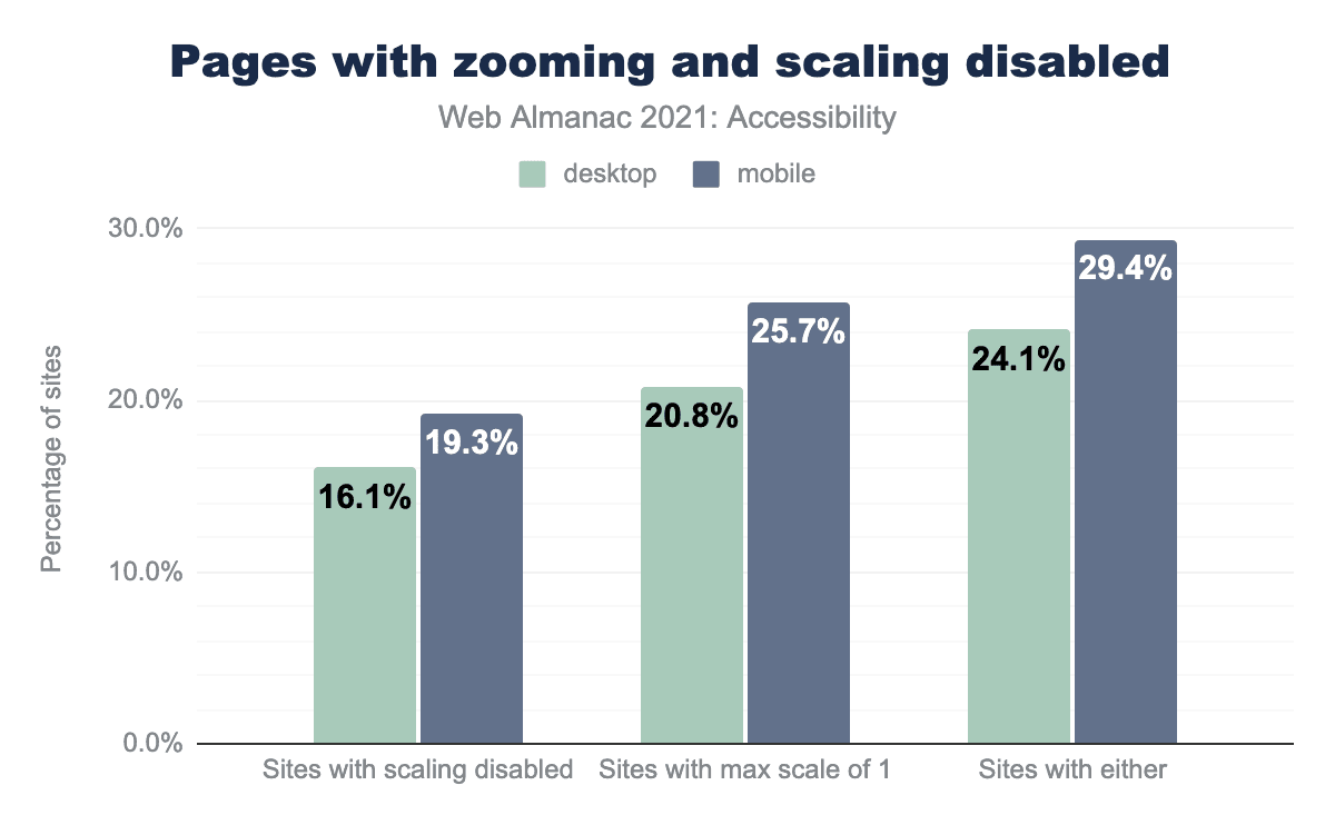 デスクトップ用ホームページの24%とモバイル用ホームページの29%が、maximum-scaleを1以下に設定するか、user-scalableを0またはnoneに設定して、スケーリングを無効にしようとしていることがわかりました。