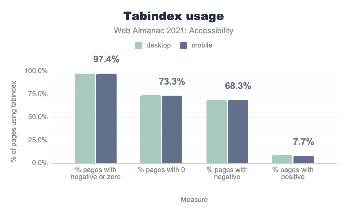 その結果、デスクトップサイトの58%、モバイルサイトの56%が、tabindex属性を何らかの形で利用していることがわかりました。