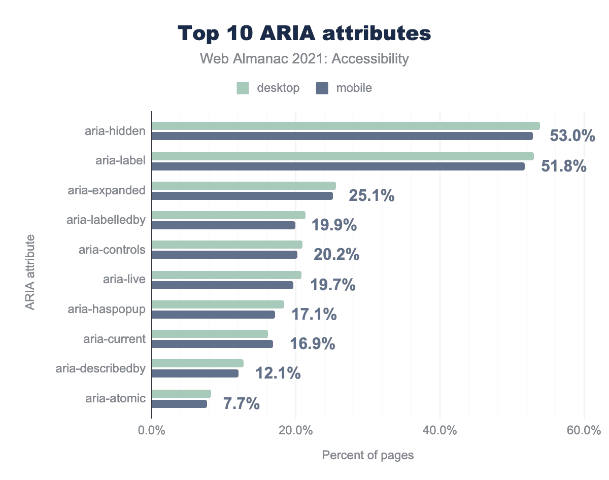デスクトップページの54%(2020年の48%から増加)とモバイルページの53%(2020年の49%から増加)に、少なくとも1つの aria-hidden 属性付き要素のインスタンスが、あることがわかりました。