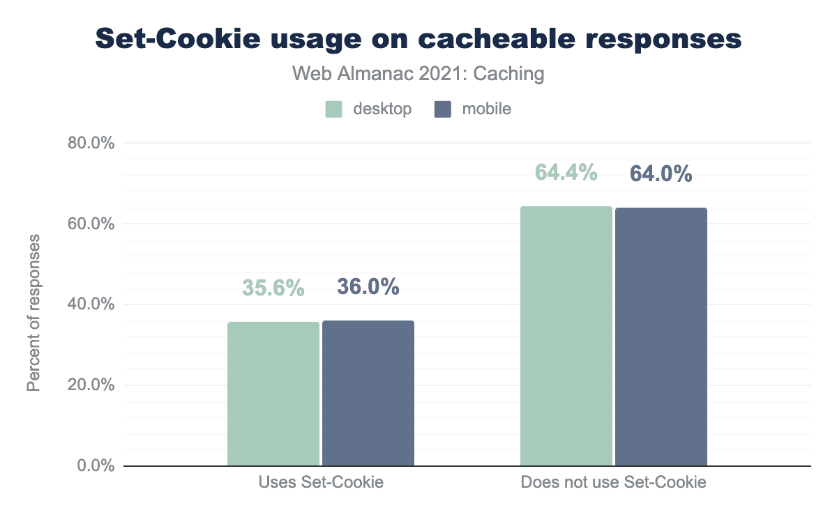 2021年には、set-cookieとキャッシュの共存に関する認識が高まっていることがわかります。set-cookieでprivateディレクティブを使用しているウェブページはまだ5%しかありませんが、キャッシュ可能な set-cookie レスポンスの総数は4.41%減少しています。