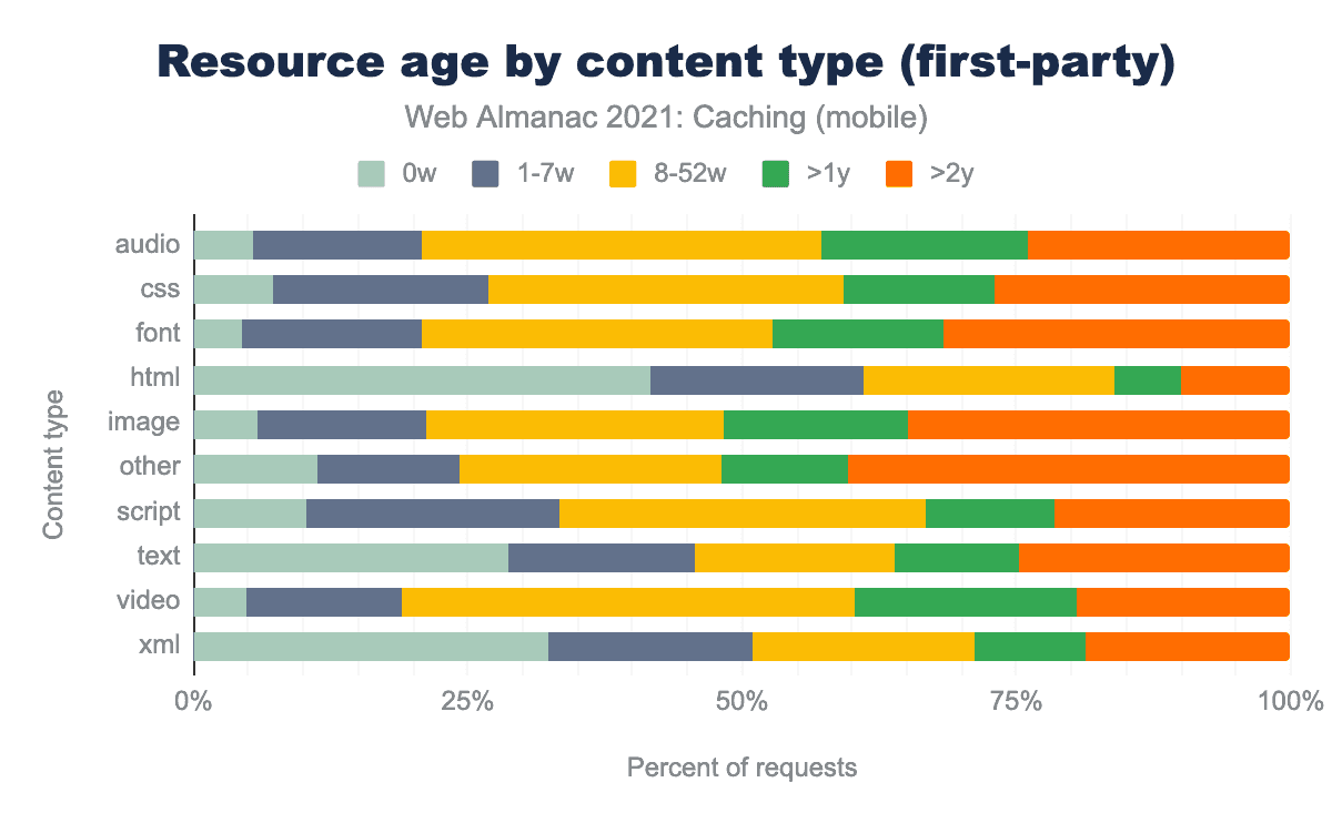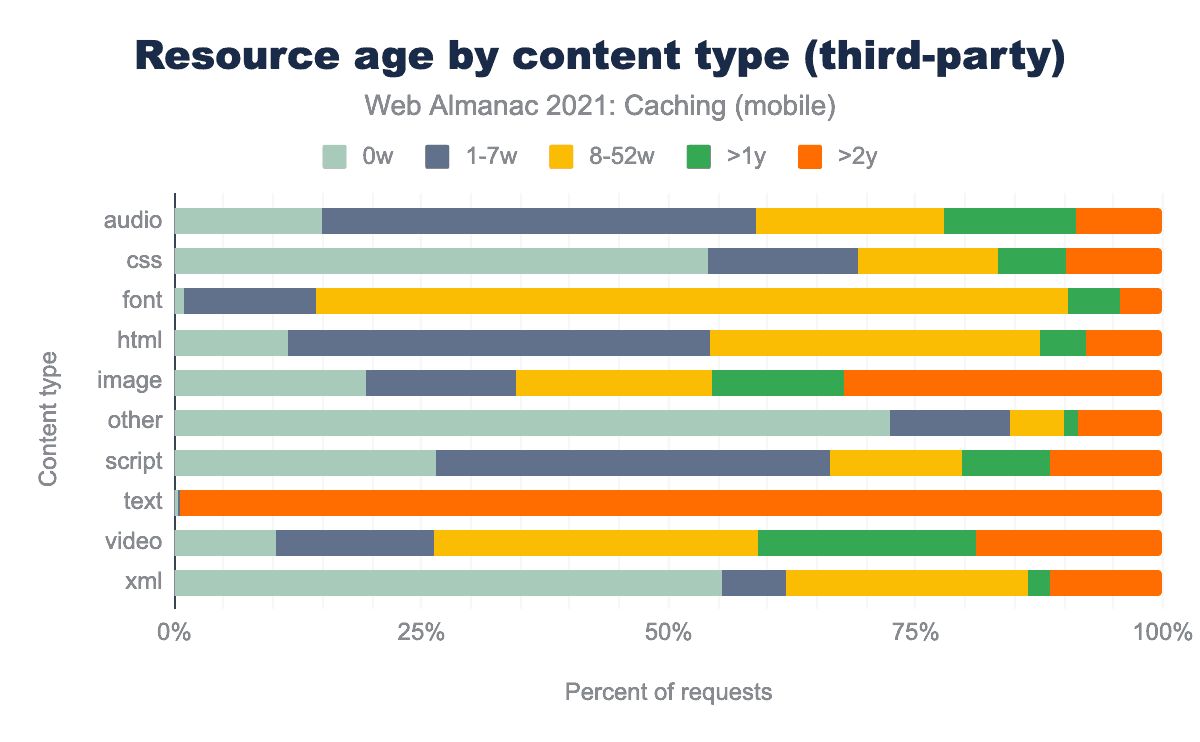 他のコンテンツタイプに分けると、サードパーティーのフォントは、8~52週間の間にもっとも多くキャッシュされ、72.4%であることがわかりました。しかし、ファーストパーティーの場合、リソースの年齢層は8~52週と2年以上に均等に分かれており、かなり大きなばらつきがあります。オーディオとスクリプトについても同様の結果が出ており、ファーストパーティでは8~52週、サードパーティでは1~7週が大半を占めています。