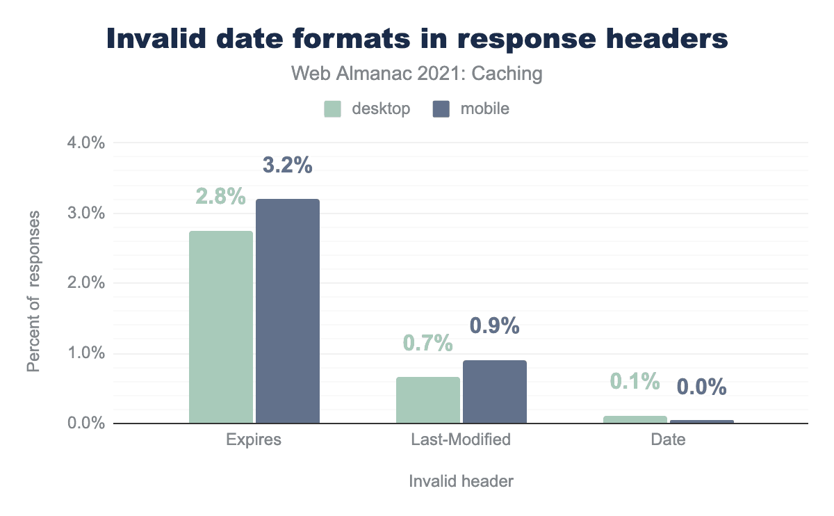 タイムスタンプを表すために使用される3つの主要なHTTPヘッダー、 DateLast-ModifiedExpires はすべて日付の書式を持つ文字列を使用します。HTTPレスポンスヘッダーの Date はほとんどの場合、ウェブサーバによって自動的に生成されるため、無効な値は非常に稀です。しかし、日付が正しく設定されていない場合、それが提供されるレスポンスのキャッシュに影響を与える可能性があります。