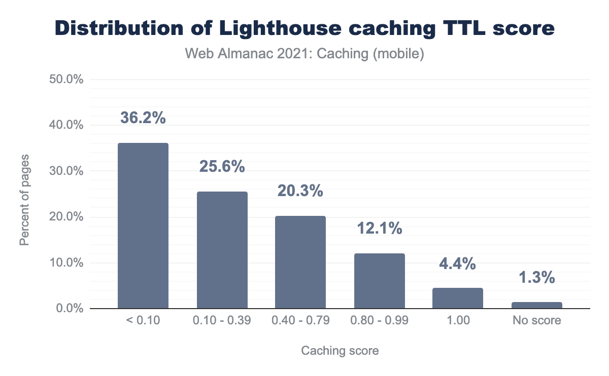 LighthouseのキャッシングTTLスコアに基づき、100点満点でランクインしたページが2020年の3.3%から2021年には4.4%に増加するという改善が見られました。