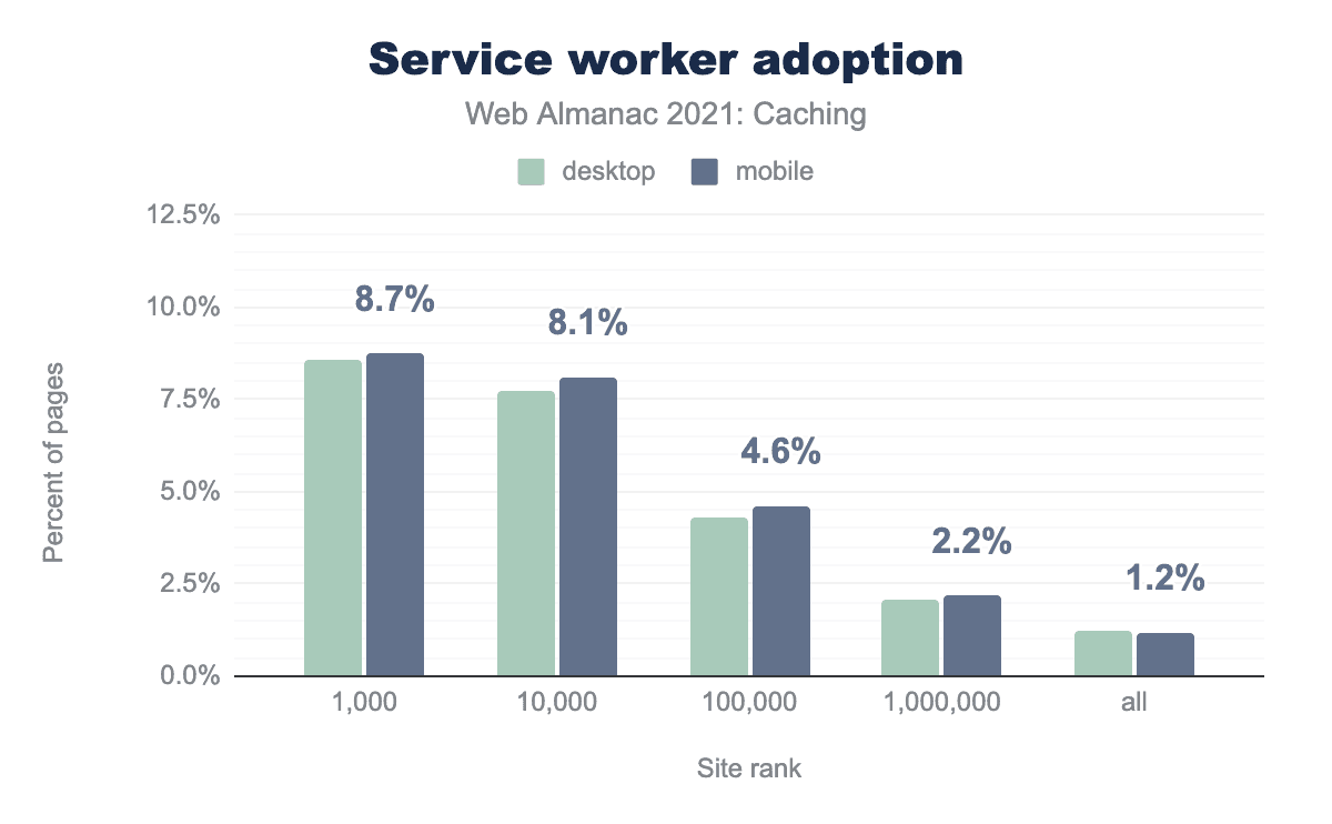 このように、とくに上位1,000ページにおいてサービスワーカーの採用率が高いのは、リモートファースト、そしてそれに関連してモバイルフレンドリーという世界的なトレンドと関係があるのかもしれません。1年を通じて1つの場所で仕事をしたり生活したりすることへの依存度がシフトするにつれて、私たちはデバイスが私たちについていくために、さらにハードでスマートな働きをすることを必要としているのです。サービスワーカーは、ユーザーが信頼性の低いネットワークやローエンドデバイスを使用している場合、パフォーマンスを向上させることができるツールです。