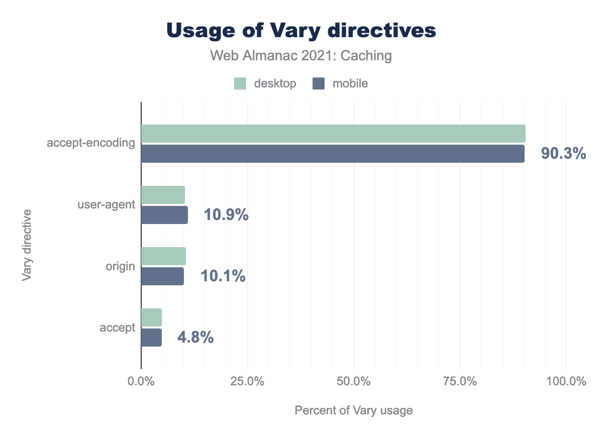 もっとも普及している Vary ヘッダーは Accept-Encoding で90.3% の使用率、次いで User-Agent で10.9% 、 Origin で10.1% 、そして Accept で4.8% の使用率です。
