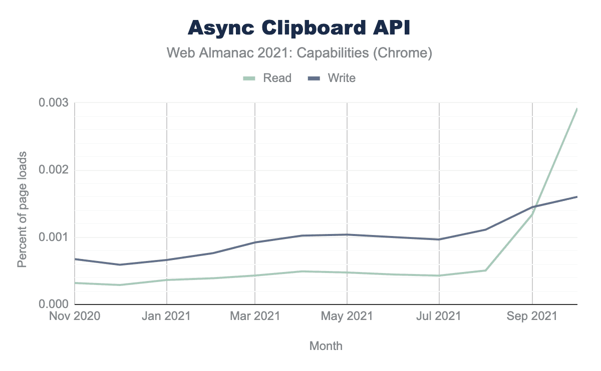 ここ数ヶ月、APIの利用が低水準で急激に増加しています。2020年11月には、read()メソッドは全ページロードの0.00032%しかアクティブになっていなかったが、2021年10月には0.002921%まで使用率が指数関数的に増加した。write() メソッドは、同期間に0.000674から0.001601パーセントに増加しました。