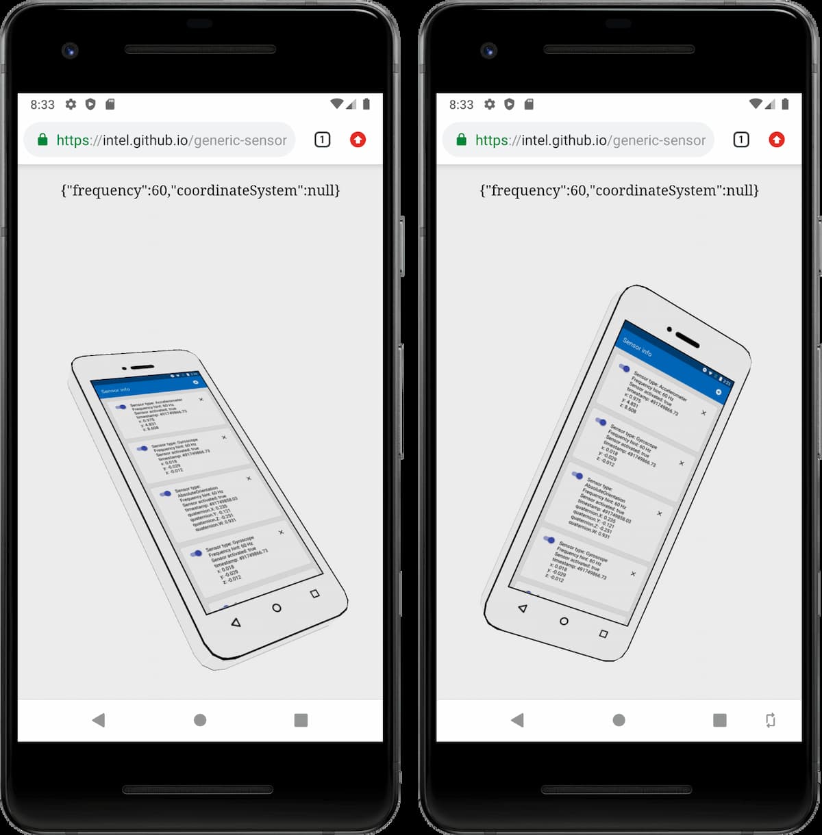 最後に汎用センサーAPI により、加速度計、ジャイロスコープ、または方向センサーなど、デバイスのセンサーからセンサーデータを読み込むことができます。センサーにアクセスするには、センサークラス、たとえば Accelerometer の新しいインスタンスを作成する。コンストラクターは、要求された周波数を持つ設定オブジェクトを受け取ります。onreadingonerror イベントにアタッチすることで、センサーの値が更新されたときやエラーが発生したときに、それぞれ通知を受けることができます。最後に、start() メソッドを呼び出して、読み取りを開始する必要があります。