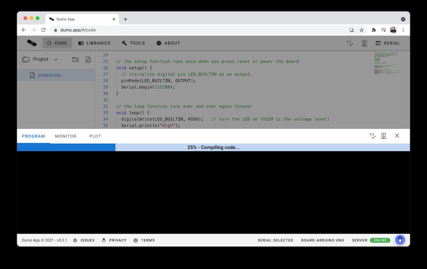 図14.16. Duinoアプリは、Webシリアルを使用してArduinoマイコンにプログラムをアップロードするWebベースのIDEです。