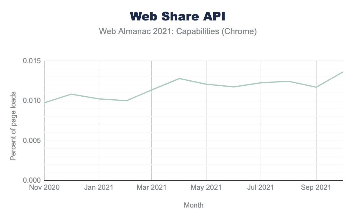 ここ数カ月、WebシェアAPIの利用が全体的に増えています。Chrome Platform Statusのデータでは、2020年11月に全ページロードの0.0097%でAPIが呼び出されてから、2021年10月には0.0136%まで、かなり直線的に伸びていることがわかります。