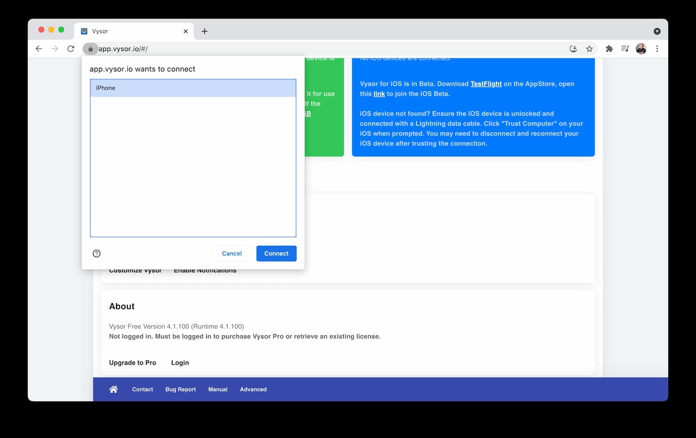 図14.12. Vysor PWAは、Web USBを利用してUSB機器と接続し、その画面の内容をデスクトップに投影できます。