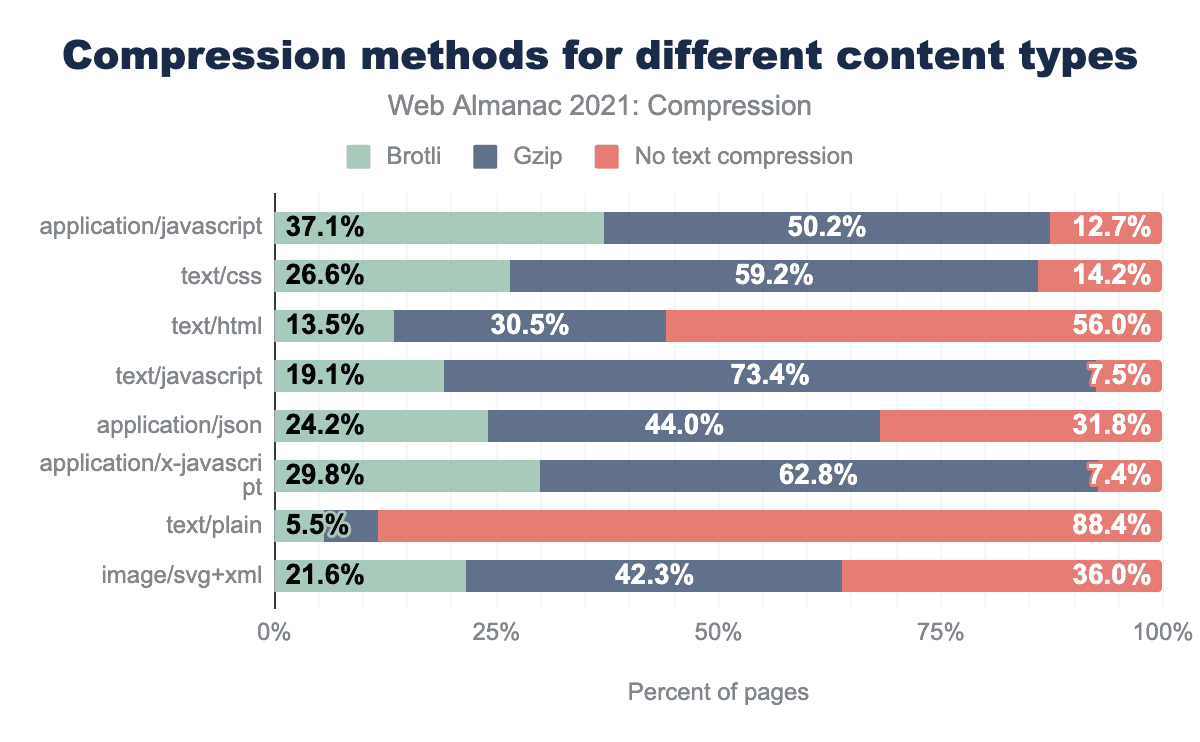 実質的にすべてのテキスト圧縮は、2つのHTTPコンテンツエンコーディングのうちの1つによって行われます。GzipとBrotliです。BrotliとGzipの両方は、事実上すべてのブラウザでサポートされています。サーバー側では、nginxやApacheなどもっとも普及しているサーバーでBrotliやGzipを使用するように設定できます。この設定は、コンテンツが生成されるタイミングによって異なります。