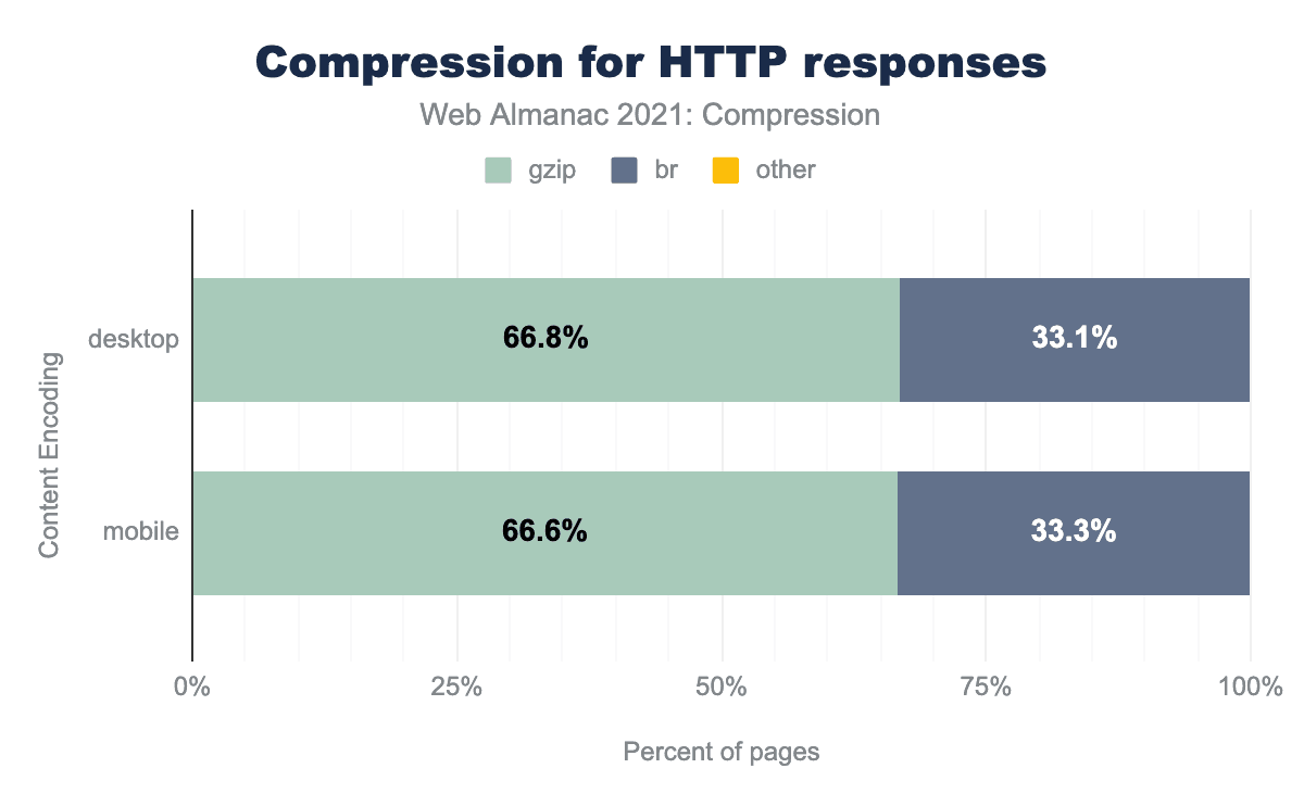 圧縮されて提供されているリソースのうち、大多数はGzip (66%) またはBrotli (33%) を使用しています。その他の圧縮アルゴリズムが使用されることはほとんどありません。この割合は、デスクトップとモバイルでほぼ同じです。