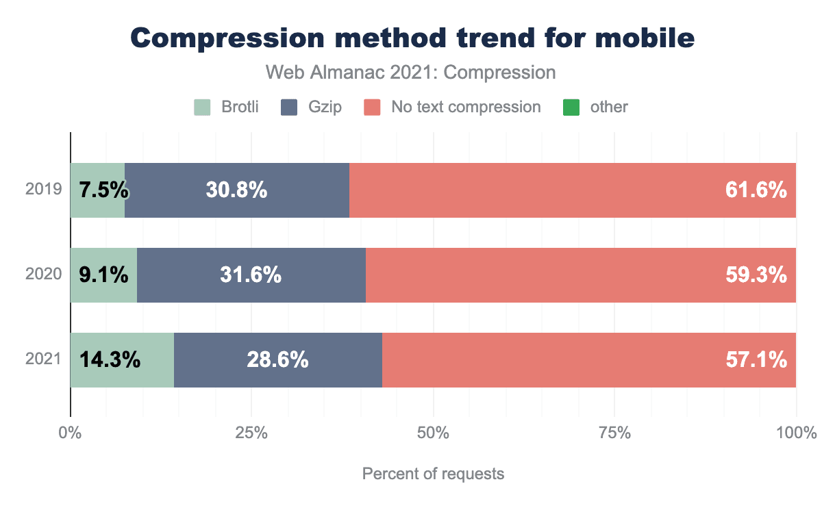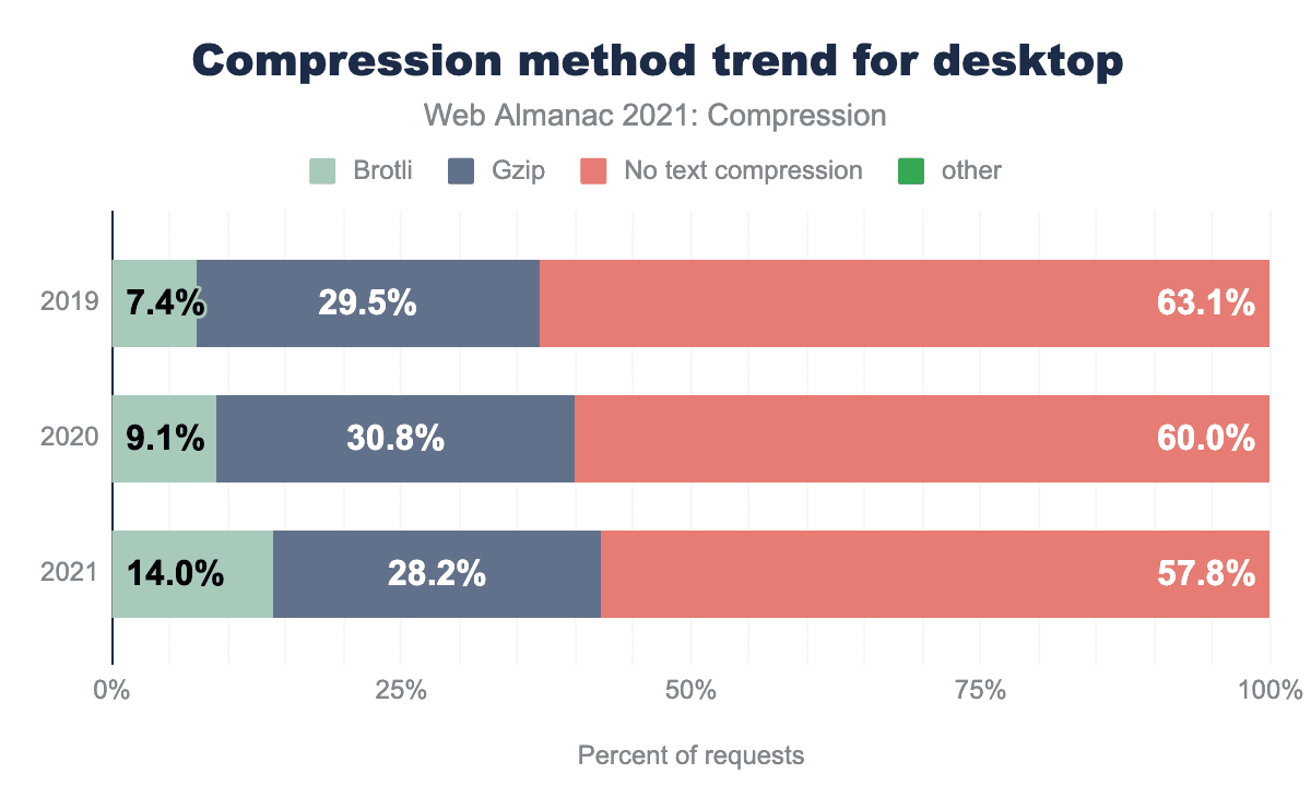 HTTP圧縮の利用が増え続けており、とくにBrotliは前年の章と比較して大きく増加しています。いずれかのテキスト圧縮を使用したHTTPレスポンスの数は2%増加しましたが、Brotliは4%以上増加しました。増えたとはいえ、サーバーの圧縮設定をいじることで、より多くのHTTP圧縮を利用できる機会があることは確かです。ご自身のウェブサイトのレスポンスとサーバーの設定をよく見てみると、その恩恵にあずかれるでしょう。圧縮を使用していない場合は圧縮を有効にすることを検討し、圧縮を使用している場合は、その場で生成されるHTMLなどの動的コンテンツと静的コンテンツの両方で、圧縮レベルを高くするように圧縮方法を調整することを検討できます。一般的なHTTPサーバーのデフォルトの圧縮設定を変更すると、ユーザーに大きな影響を与える可能性があります。