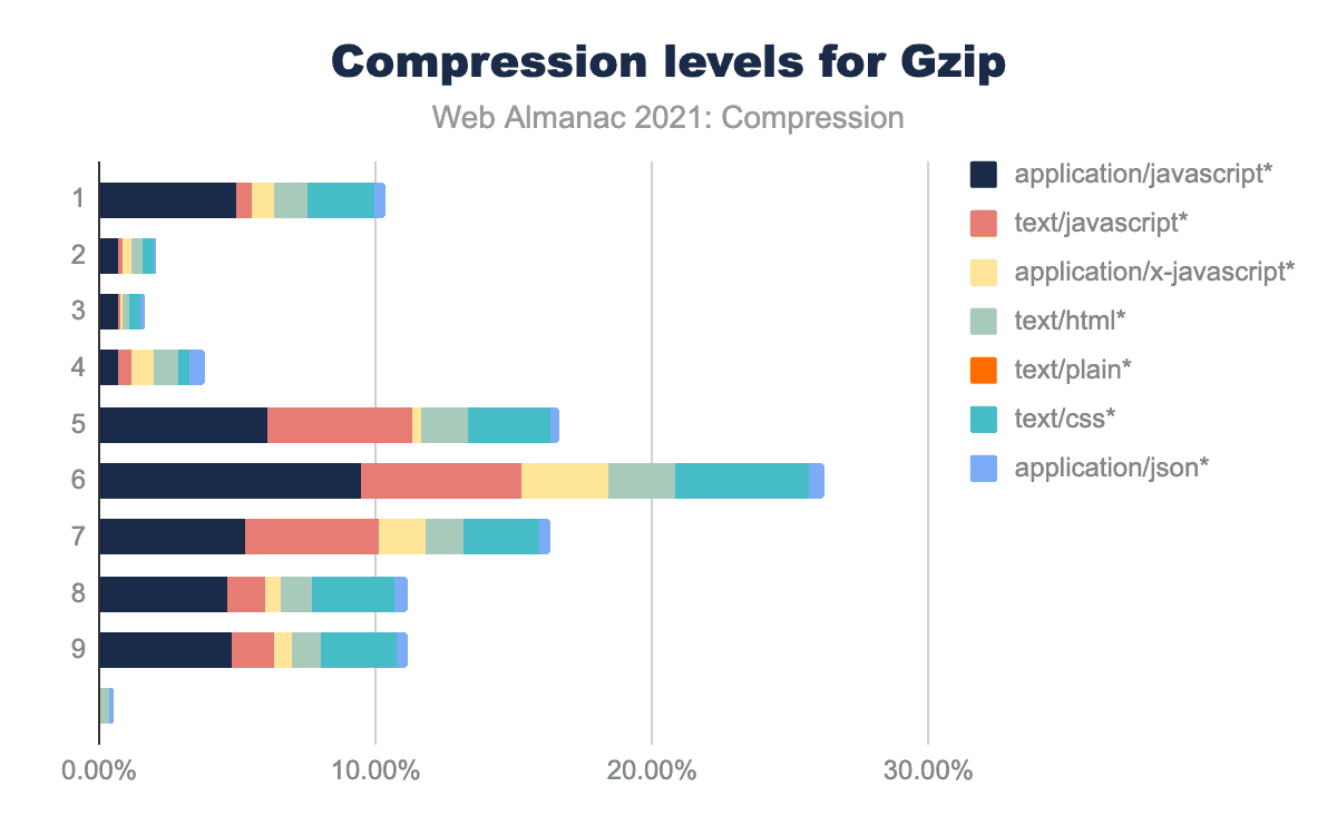 opt の使用状況を示す棒グラフの積み重ね。レベル1とレベル6にピークがあり、レベル9まで延びていることがわかります。また、各レベルはコンテンツの種類によって分けられている。図は、各圧縮レベルをコンテンツタイプ別に分けたものです。ほぼすべてのケースで、JavaScriptがもっとも一般的なコンテンツタイプです。Brotliでは、もっとも高い圧縮レベルではJavaScriptの割合が低い圧縮レベルよりも高く、低い圧縮レベルではJSONが多くなっている。Gzipでは、JavaScriptのコンテンツタイプの分布はどのレベルでもほぼ同じです。
