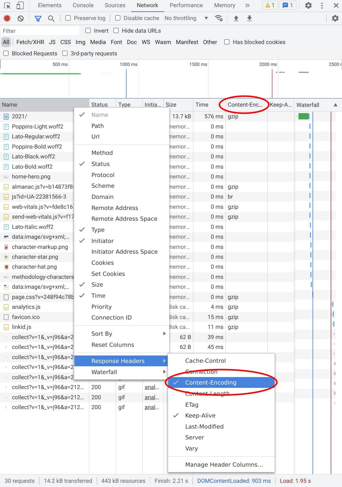WebサイトのどのコンテンツがHTTP圧縮を使用しているかを確認するには、Firefox Developer Tools または Chrome DevTools を使用することが可能です。開発者ツールで、「ネットワーク」タブを開き、サイトを再読み込みしてください。HTML、CSS、JavaScript、フォント、画像などのレスポンスのリストが表示されるはずです。どれが圧縮されているかを確認するには、その応答ヘッダーのコンテンツエンコーディングをチェックします。列を有効にすることで、すべてのレスポンスについて一度に簡単に確認できます。これを行うには、列のタイトルを右クリックし、メニューの[レスポンスヘッダー]に移動して[コンテンツエンコード]を有効にします。