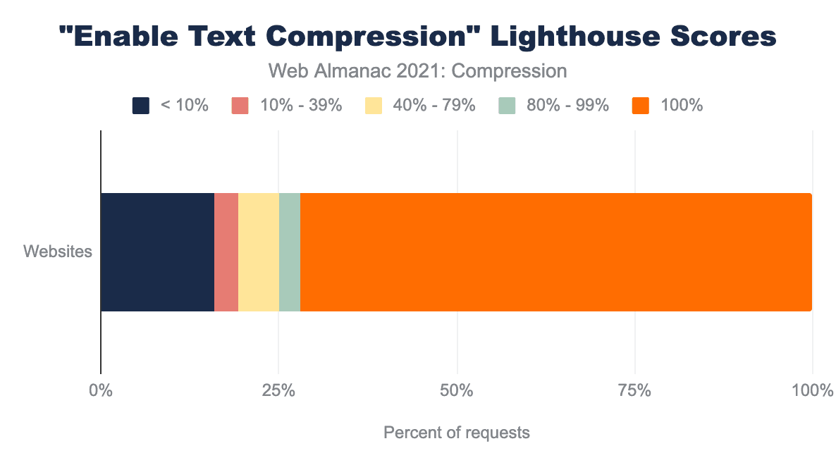 HTTP Archiveでは、すべてのモバイルページに対してLighthouse監査を実施しており、このデータから72%のWebサイトがこの監査に合格していることが確認されました。これは、昨年の 74%より2%少なく、これは昨年と比較して全体的にテキスト圧縮の使用率が高いにもかかわらず、わずかに低下しています。