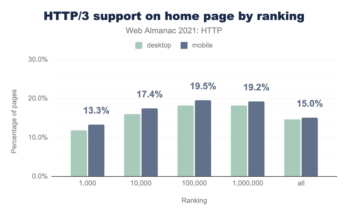 この章の前半で、上位にランクされたサイトほどHTTP/2の採用率が、高いことがわかりました。意外なことに、HTTP/3ではその逆が当てはまります。上位1000サイトのサポートは上位100万サイトよりも少なく、モバイルサイトでのサポートがわずかに多く実装されていることがわかります。