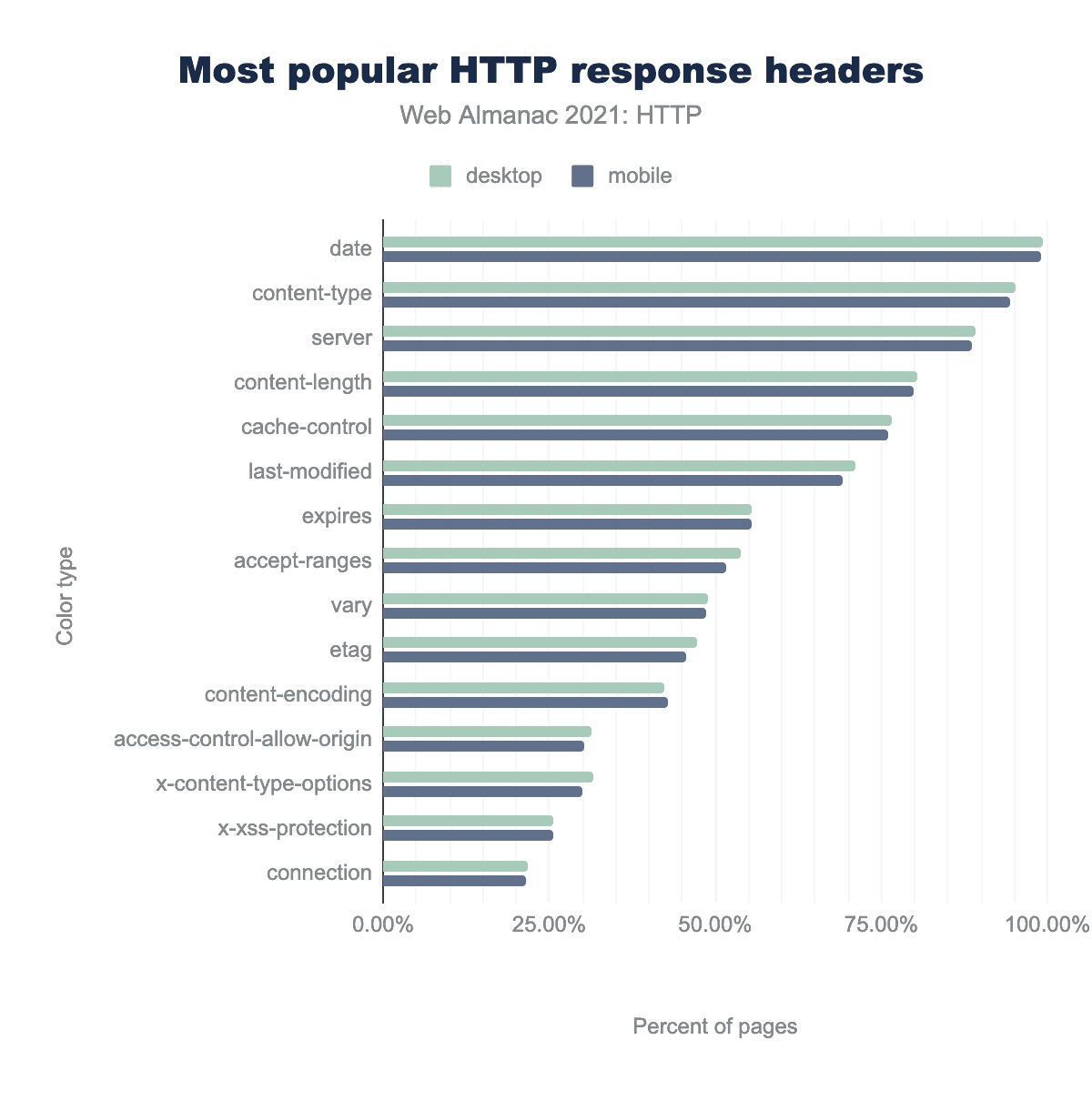 ウェブページの中央値では、デスクトップで34KB、モバイルで31KB相当のヘッダーが返されます。90パーセンタイルでは、デスクトップで98KB、モバイルで94KBに増加します。しかし、レスポンスヘッダーの最大のインスタンスは5.38MB以上でした。多くのサイトで、1MBを超えるレスポンスヘッダーが発見されました。一般的に、これらの大きなレスポンスヘッダーは、オーバーウェイトの CSP または P3P ヘッダーが原因であり、ウェブサイト間でこれらのヘッダーの複雑さや誤った管理を示唆しています。他の極端な例では、複数の Set-Cookies や Cache-Control の設定を重複させるアプリケーションの設定ミスやエラーが原因で、ヘッダーが過大になっています。