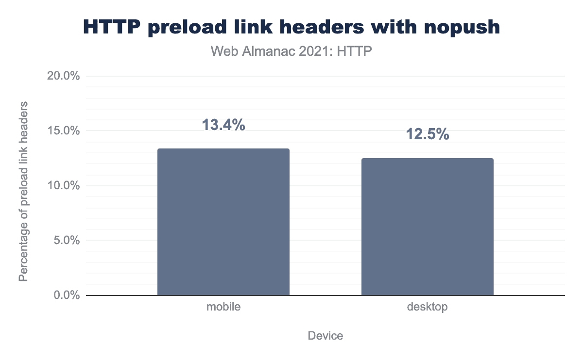 多くのHTTP/2の実装では、preload resource hint をプッシュするためのシグナルとして再利用していました。しかし、場合によっては、開発者がアセットをプリロードしたいが、HTTP/2プッシュメカニズムで配信されるのは嫌だと判断することがあります。CDNや他の下流のサーバーに、nopush ディレクティブを使って、プッシュを試みないように合図したいかもしれません。今年のデータでは、20万件以上のプリロードヘッダーが使用され、そのうちの平均12%がnopush属性で発行されたことが分かっています。