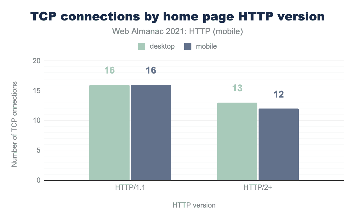 本稿執筆時点では、デスクトップ接続数は12か月間で44%減の16接続(中央値)。モバイルは7%減で、接続数の中央値は12です。これは、2020年以降にHTTP/2の採用が急増したため、時間の経過とともに接続数が減少していることを表しています。