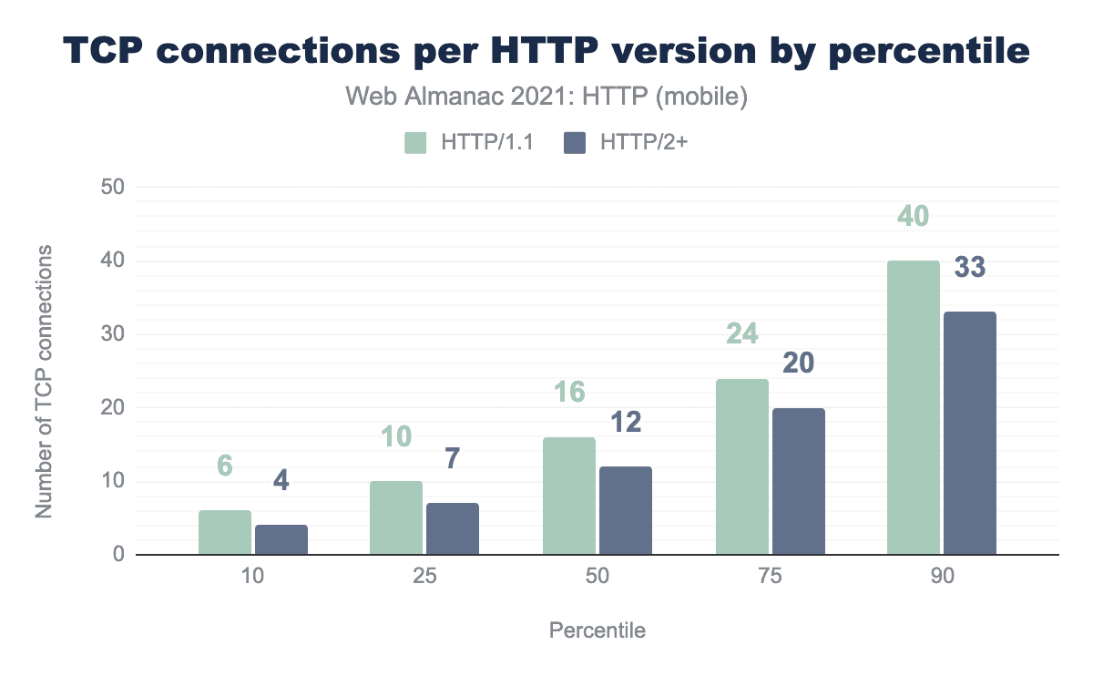 収集したHTTP Archiveのデータによると、HTTP/1.1サイトの中央値は、1ページあたり16コネクションになります。75パーセンタイルでは24コネクションになります。モバイルとデスクトップでは、90パーセンタイルで40と2倍以上になります。一方、HTTP/2サイトでは、中央値で12、75パーセンタイルで21、90パーセンタイルで33の接続が発生します。トップエンドでも、ウェブサイト全体で使用される接続数が21%減少していることになります。