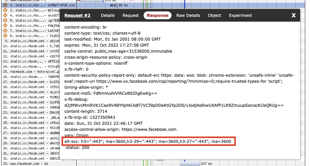 alt-svc が検出された後、HTTP3に切り替わります。また、コネクション合体(コネクションの再利用)により、2つのホスト名がDNS上で同じIPに解決し、同じTLS証明書とバージョンを使用する場合、クライアントは両方のホスト名で同じコネクションを再利用できる場合があります。したがって、使用するホストとTLS証明書の数に応じて、HTTP/2とHTTP/3の両方が混在するウォーターフォール リクエストを目にすることは珍しくありません。