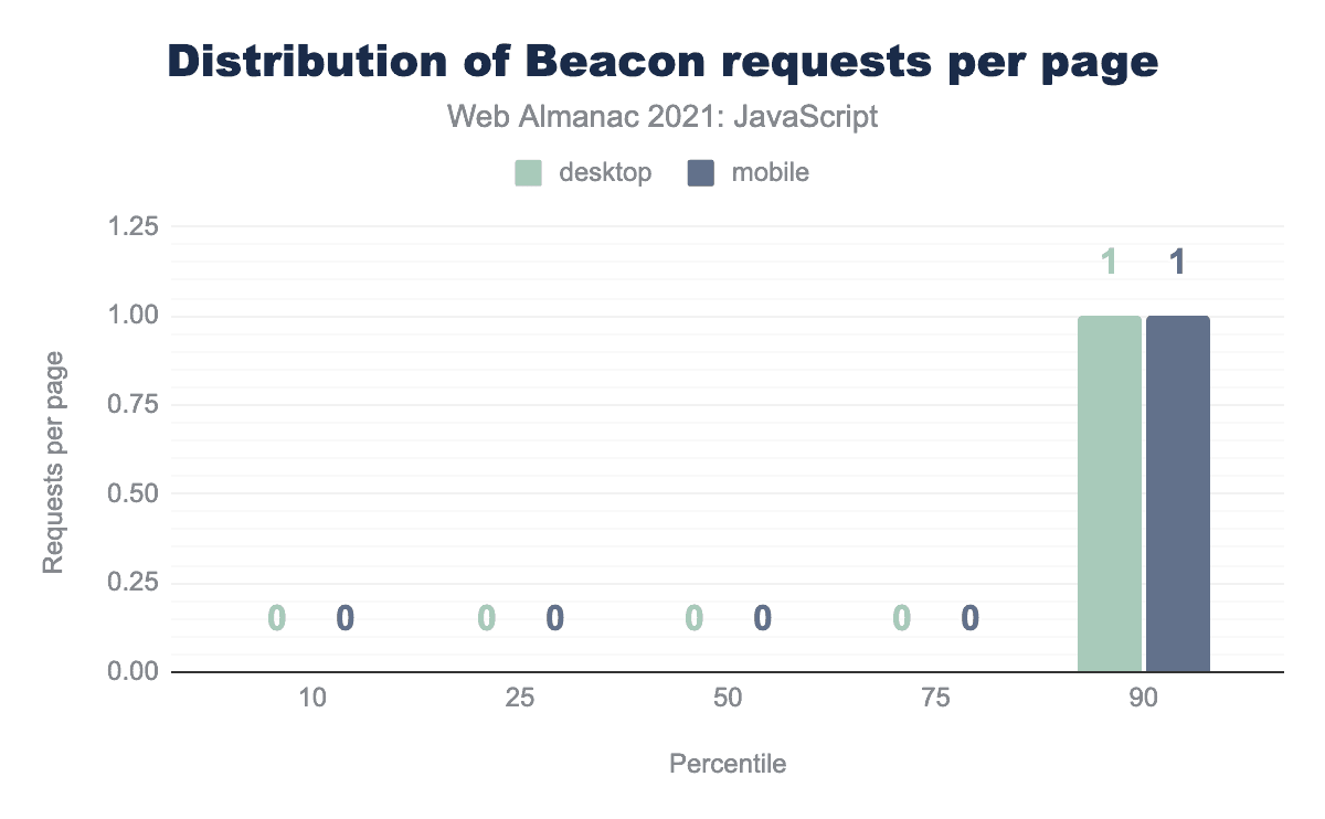 Beaconの使用率はほとんどなく、1ページあたりのリクエスト数は0で、90パーセンタイルまでは1ページあたり1つのリクエストしかありませんでした。この普及率の低さを説明する1つの可能性として、Beaconは一般的に分析データの送信に使用され、とくに、すぐにページをアンロードされる可能性があっても確実にリクエストを送信したい場合に使用されることが挙げられます。しかし、XHRを使用している場合、これは保証されていません。将来的には、分析データやセッションデータなどのために、XHRを使用しているページの統計情報を収集できるかどうかを試してみるとよいでしょう。