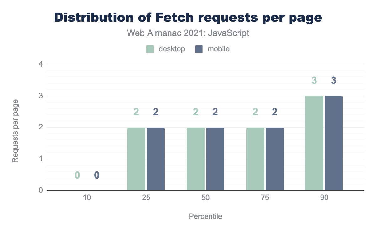 Fetch APIを使用した場合、モバイルページの中央値では2回のリクエスト、ロングテールでは3回のリクエストに達します。このAPIはXHRの標準的なリクエスト方法になりつつありますが、その理由の1つは、よりクリーンなアプローチと、定型的なコードが少ないことです。また、Fetchは従来のXHRアプローチよりもパフォーマンス上のメリットがあるかもしれません。これは、ブラウザがメインスレッドから大きなJSONペイロードをデコードする方法によるものです。