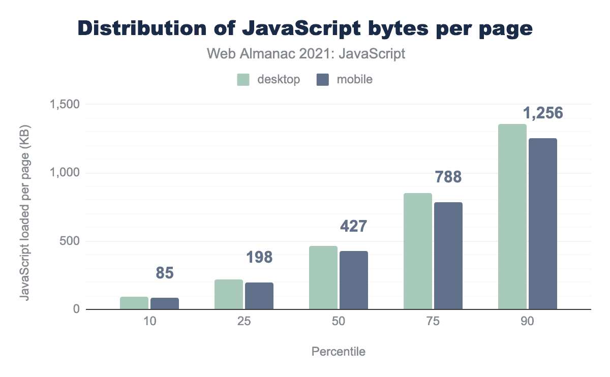 50パーセンタイル(中央値)のモバイルページでは427KBのJavaScriptがロードされるのに対し、デスクトップデバイスでロードされるページの中央値では463KBが送信されます。