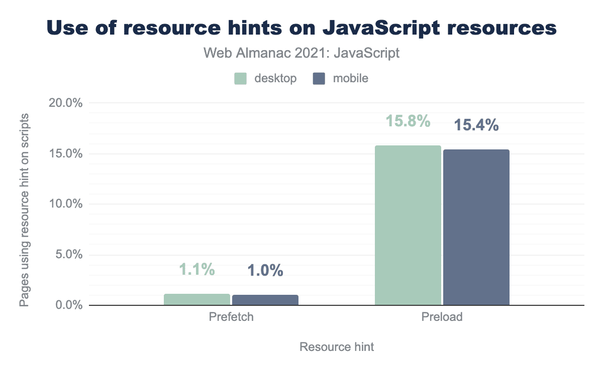 prefetchを使用し、デスクトップリソースの15.8%とモバイルページの15.4%が、1つ以上のJavaScriptリソースにpreloadを使用していることを示す棒グラフです。preloadヒントは、15.4%のモバイルページでJavaScriptのロードに使用されていますが、prefetchヒントは1.0%のモバイルページでしか使用されていません。デスクトップページでは、それぞれ15.8%と1.1%がJavaScriptリソースの読み込みにこれらのリソースヒントを使用しています。