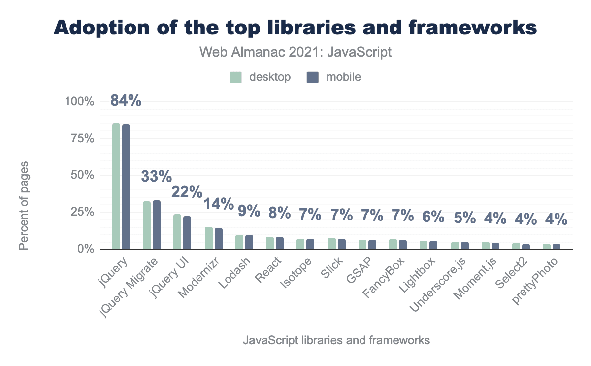 2021年になっても、なぜjQueryが主流なのか不思議に思うかもしれません。これには主に2つの理由があります。まず、前年よりも強調されているように、ほとんどのWordPressサイトがjQueryを使用しています。CMSの章によると、WordPressはすべてのWebサイトの約3分の1で使用されているため、これがjQuery採用の大きな割合を占めています。また、他の主要なJavaScriptライブラリの中にも、何らかの形でjQueryを利用しているものがあり、間接的にjQueryが採用されていると考えられます。