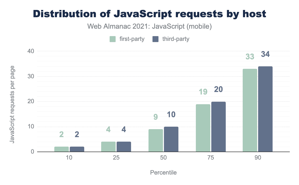 JavaScriptをどれだけ読み込むか?のセクションで、モバイルページのJavaScriptリクエスト数の中央値が20であることを思い出してください。このセクションでは、ファーストおよびサードパーティのJavaScriptリクエストの内訳を見てみましょう。