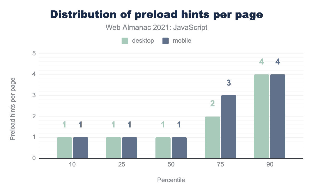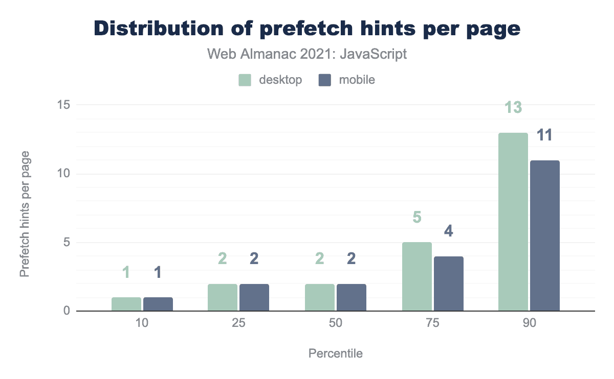 モバイルページあたりのpreloadヒントの数の中央値は変わりませんが、prefetchヒントの数は1ページあたり3つから2つに減りました。中央値では、これらの結果はモバイルページとデスクトップページの両方で同じであることに注意してください。