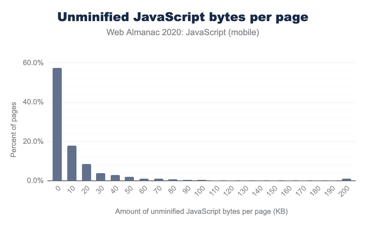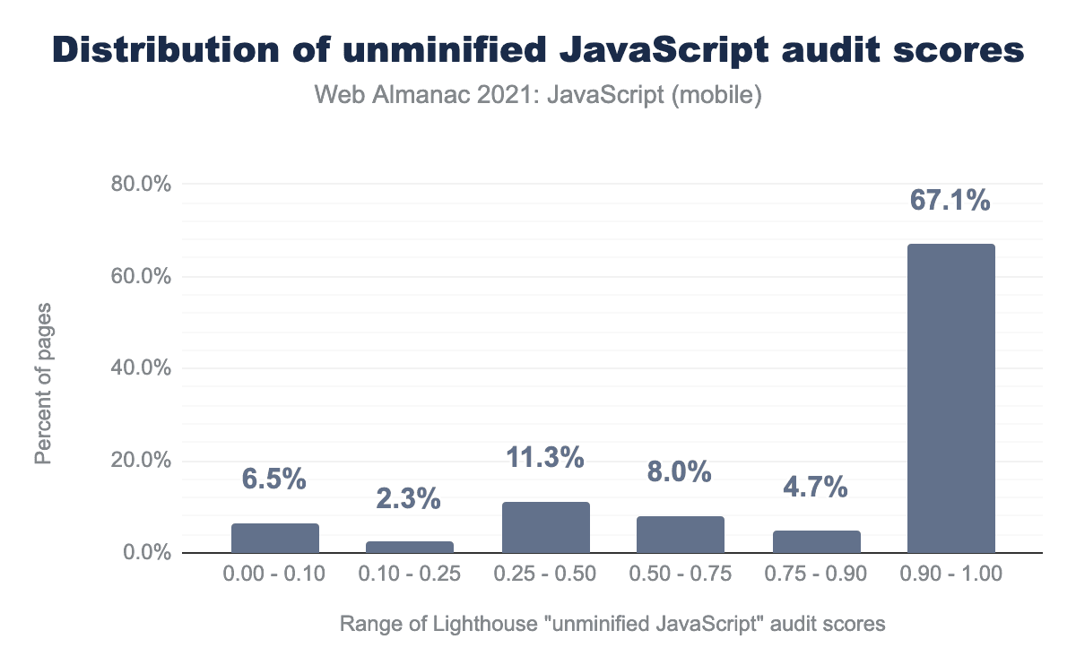 ここで、0.00は最悪のスコアを表し、1.00は最高のスコアを表します。モバイルページの67.1%は、オーディットスコアが0.9から1.0の間にあります。つまり、JavaScriptの未最適化のスコアが0.9よりも悪く、コードの最小化をより有効に活用できるページがまだ30%以上あるということです。2020年版の結果と比較すると、「未処理のJS」のスコアが0.9から1.0の間にあるモバイルページの割合は10ポイント減少しました。