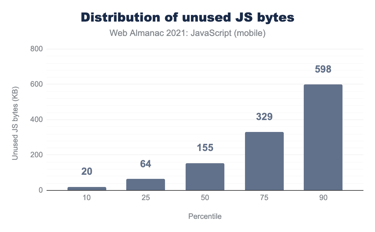 Lighthouseによると、モバイルページの中央値では、155KBの未使用のJavaScriptがロードされています。また、90パーセンタイルでは、598KBのJavaScriptが使われていません。