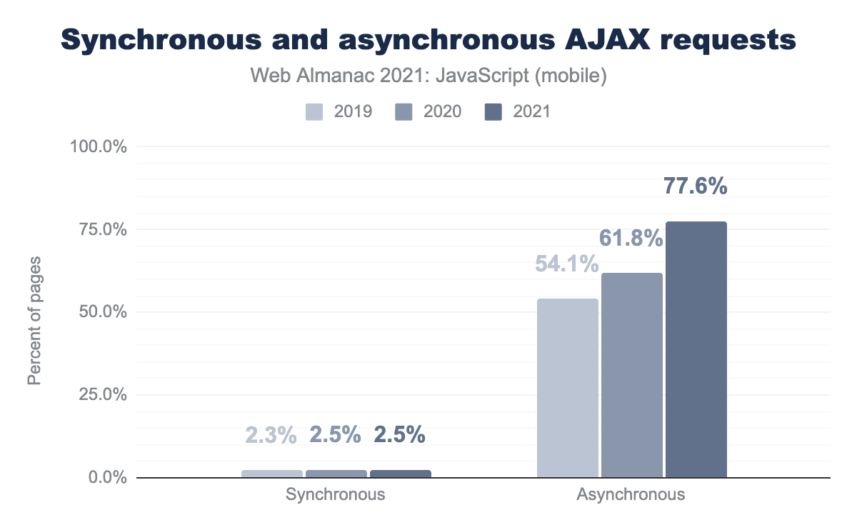 モバイルページの2.5%が、非推奨の同期型AJAXリクエストを使用しています。これを踏まえて、過去2年間の結果と比較して、その傾向を見てみましょう。